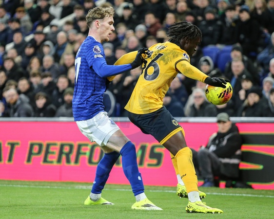 Mateus Mane of Wolverhampton Wanderers holds off James Garner of Everton during the Premier League match Everton vs Wolverhampton Wanderers at Hill Dickinson Stadium, Liverpool, United Kingdom, 7th January 2026, Credit:Richard Bierton/News Images / Avalon