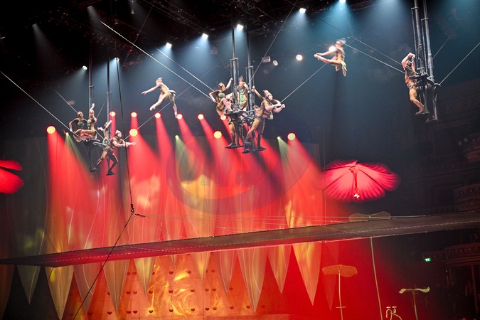 London, UK, 08 January 2026. Cast members perform the Aerial Cradle - Nansy Damianova (Canada), Nina Kartseva (Russia), Inna Rudenko (Ukraine), Olivia Kapitany (Hungary), Lola Pintos (Argentina), Maly Arantes Franca (Brazil), Camille Santerre-Gervais (Canada), Joseane Martins Costa (Brazil)Denys Dyky (Ukraine), Nikolay Karyachkin (Russia), Gui Figur Fortes (Brazil), Tamas Fuleman (Hungary), Victor Huusko (Finland), Dmytro Rybkin (Ukraine) -during the dress rehearsal of the Cirque du Soleil's production of 'OVO' at the Royal Albert Hall, London, UK. Editorial Use Only., Credit:Lee Floyd / Avalon