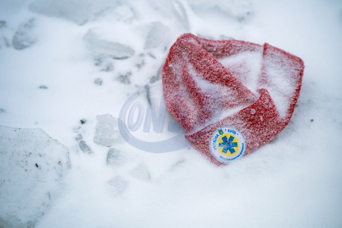 A hat of a paramedic, who had arrived at the scene of a Russian drone strike on a multi-storey apartment block in the Darnytskyi district and was killed by a repeat strike, lies in the snow, Kyiv, Ukraine, on January 9, 2026., Credit:Danylo Antoniuk / Avalon