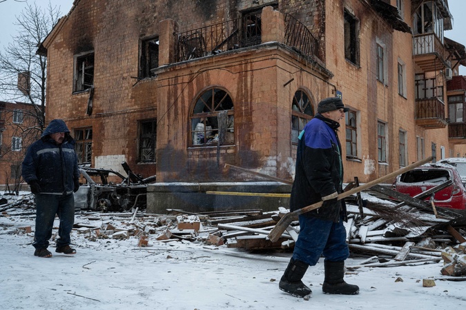 Municipal workers walk past a three-storey residential building in the Dniprovskyi district damaged by Russia's large-scale overnight strike, Kyiv, Ukraine, on January 9, 2026., Credit:Danylo Antoniuk / Avalon