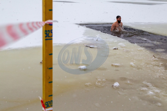 A man bathes in an ice hole during the Epiphany celebration on Venetsiia (Venice) Beach, Kyiv, Ukraine, January 6, 2026., Credit:Kirill Chubotin / Avalon