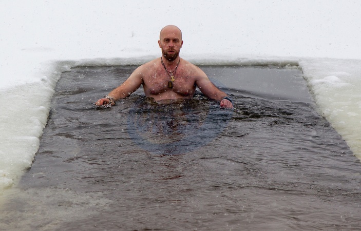 A man bathes in an ice hole during the Epiphany celebration on Venetsiia (Venice) Beach, Kyiv, Ukraine, January 6, 2026., Credit:Kirill Chubotin / Avalon