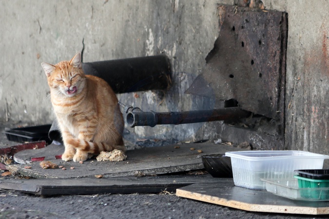 A ginger cat licks its muzzle after eating wet food left by caring residents, as stray cats shelter from the winter cold in the basement of an apartment block in Kyiv, Ukraine, on January 5, 2026., Credit:Yuliia Ovsiannikova / Avalon