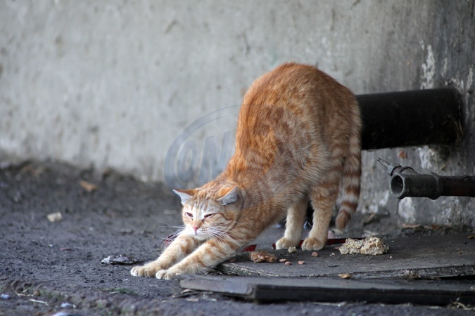 A ginger cat stretches its back as stray cats shelter in the basement of an apartment block from the winter cold, Kyiv, Ukraine, January 5, 2026., Credit:Yuliia Ovsiannikova / Avalon
