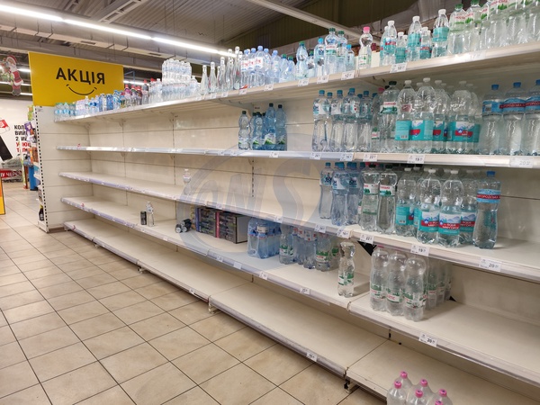 Shelves with bottled water are almost empty at a local supermarket, Dnipro, Ukraine, on January 8, 2026. Following a massive Russian drone attack on the energy infrastructure of Ukraine's southern regions, most consumers in Dnipropetrovsk and Zaporizhzhia regions, including the regional capitals, were left without power. In the Dnipropetrovsk region, more than one million people were left without water and heat., Credit:Mykola Miakshykov / Avalon