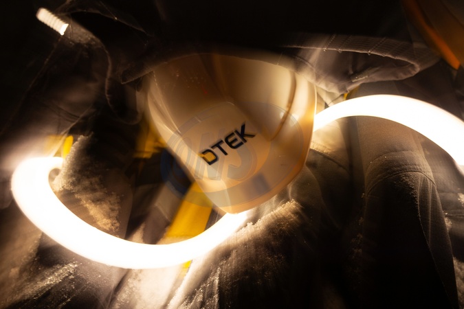 A hard helmet and an LED strip decorate the "Christmas Tree of Light” installation, made from the uniforms of DTEK energy workers, near the entrance to a bakery in Sofiiska Square in Kyiv, Ukraine, on January 7, 2026. Initiated by the Zavertailo bakery together with the Honey confectionery and implemented jointly with DTEK, the art object celebrates energy-sector employees who for the fourth year have been restoring electricity supplies after Russian strikes., Credit:Kirill Chubotin / Avalon