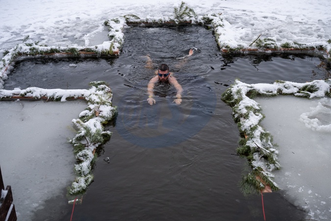 A man swims in a cross-shaped ice hole at the X-Park Sports Complex during the Epiphany celebration, Kyiv, Ukraine, January 6, 2026., Credit:Danylo Antoniuk / Avalon