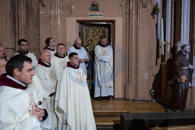 Priests participate in a service marking the transfer of St. Nicholas Church by Ukraine's Culture Ministry to the Religious Community of St. Nicholas Parish of the Roman Catholic Church for free use, in Kyiv, Ukraine, on January 6, 2026., Credit:Danylo Antoniuk / Avalon