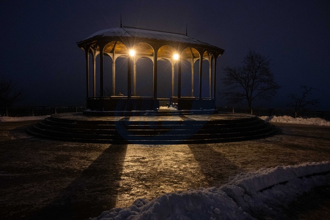 Two lamps shed light inside a gazebo in Volodymyrska Hirka Park in the evening, Kyiv, Ukraine, January 7, 2026., Credit:Danylo Antoniuk / Avalon