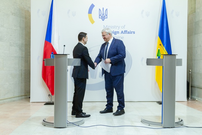Minister of Foreign Affairs of Ukraine Andrii Sybiha (R) shakes hands with Deputy Prime Minister, Minister of Foreign Affairs and Minister for the Environment of the Czech Republic Petr Macinka, who is on his first official visit to Ukraine, at the end of a joint news conference following their meeting, Kyiv, Ukraine, January 9, 2026. The officials discussed a wide range of bilateral issues, including defence cooperation and the continued implementation of the Czech Ammunition Initiative., Credit:Kirill Chubotin / Avalon