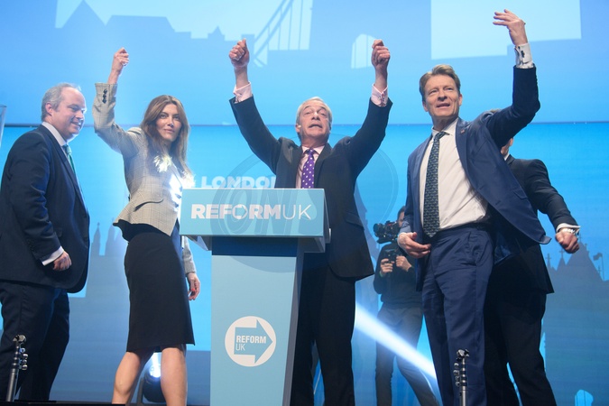 (L-R) - Alex Lawson, Laila Cunningham, Nigel Farage - Reform UK Leader, Richard Tice, David Bull at a Reform UK Rally at ICC Auditorium, Excel Centre in London, England, UK on Friday 9 January, 2026., Credit:Justin Ng / Avalon