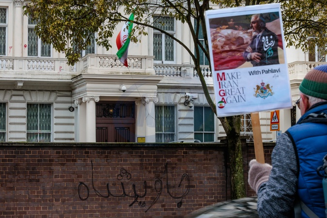 Iranian Embassy, London, UK. 9th January 2026.Graffiti in Farsi in front of the Iranian embassy in London translates to 'Javid Shah' (Long Live the King) ahead of a rally in a show of unity and solidarity with the protestors in Iran.The Iranian monarchists are calling for a free and democratic Iran and the return of Pahlavi., Credit:Photo by Amanda Rose / Avalon