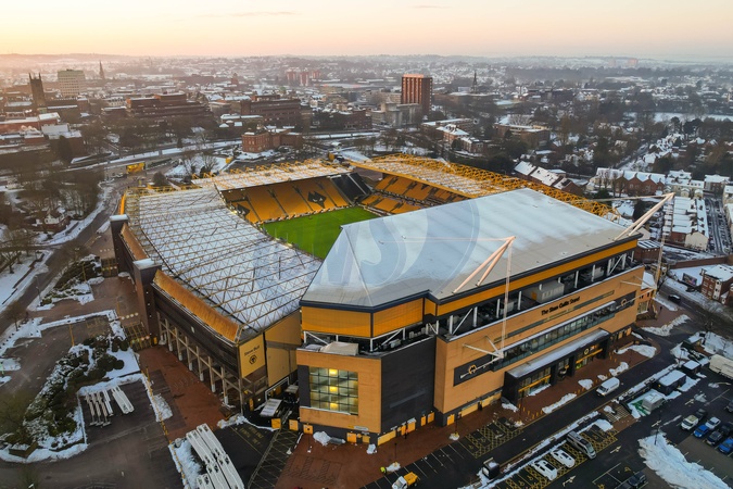 An aerial view of the Molineux Stadium before the Emirates FA Cup Third Round match Wolverhampton Wanderers vs Shrewsbury Town at Molineux, Wolverhampton, United Kingdom, 10th January 2026, Credit:Euan Manning/News Images / Avalon