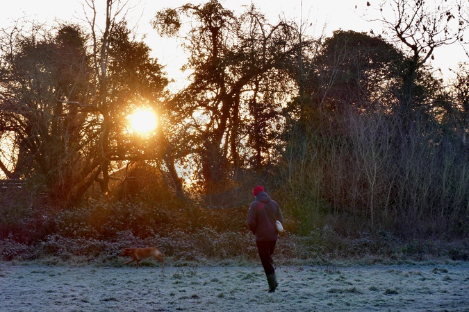 Walkers out at daybreak on a cold and frosty morning in the countryside., Credit:Geoffrey Swaine / Avalon