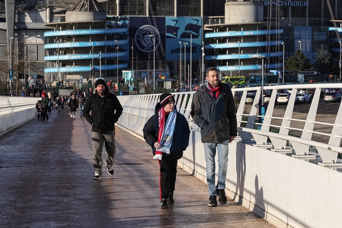 Exeter City fans arrive at the Etihad Stadium during the Emirates FA Cup Third Round match Manchester City vs Exeter City at Etihad Stadium, Manchester, United Kingdom, 10th January 2026, Credit:Mark Cosgrove/News Images / Avalon