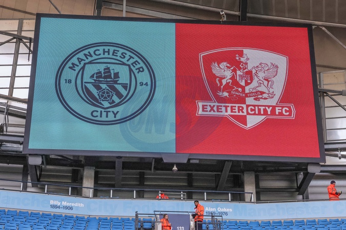 Manchester City vs Exeter City on the large LCD screen during the Emirates FA Cup Third Round match Manchester City vs Exeter City at Etihad Stadium, Manchester, United Kingdom, 10th January 2026, Credit:Mark Cosgrove/News Images / Avalon