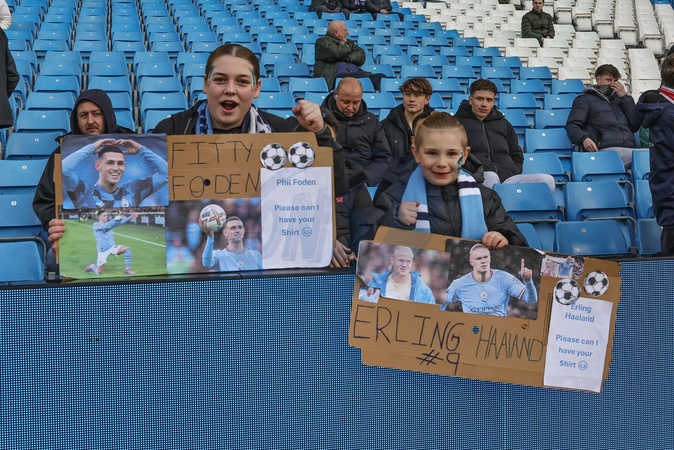 Young Man City fans with home made banners for Phil Foden of Manchester City and Erling Haaland of Manchester City during the Emirates FA Cup Third Round match Manchester City vs Exeter City at Etihad Stadium, Manchester, United Kingdom, 10th January 2026, Credit:Mark Cosgrove/News Images / Avalon