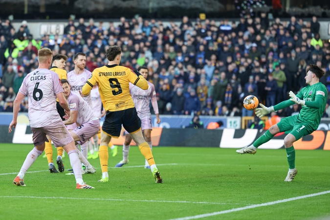 Jorgen Strand Larsen of Wolverhampton Wanderers shoots on goal but its saved by Elyh Harrison of Shrewsbury Town during the Emirates FA Cup Third Round match Wolverhampton Wanderers vs Shrewsbury Town at Molineux, Wolverhampton, United Kingdom, 10th January 2026, Credit:Euan Manning/News Images / Avalon