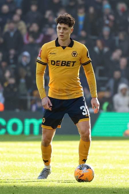 Hugo Bueno of Wolverhampton Wanderers with the ball during the Emirates FA Cup Third Round match Wolverhampton Wanderers vs Shrewsbury Town at Molineux, Wolverhampton, United Kingdom, 10th January 2026, Credit:Euan Manning/News Images / Avalon