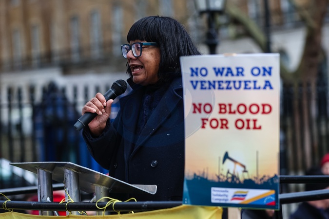 MP Diane Abbott speaks at a protest against US military action in Venezuela outside Downing Street in London, UK, on 10 January 2026, holding placards calling on UK Prime Minister Keir Starmer to condemn the United States and President Donald Trump., Credit:Pete Speller / Avalon