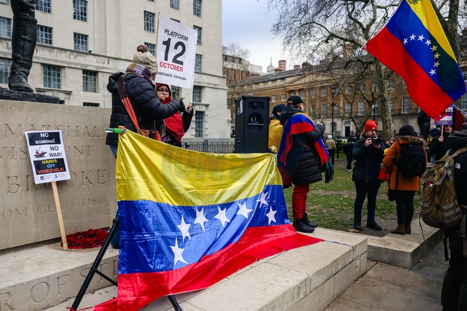 Protest against US military action in Venezuela outside Downing Street in London, UK, on 10 January 2026