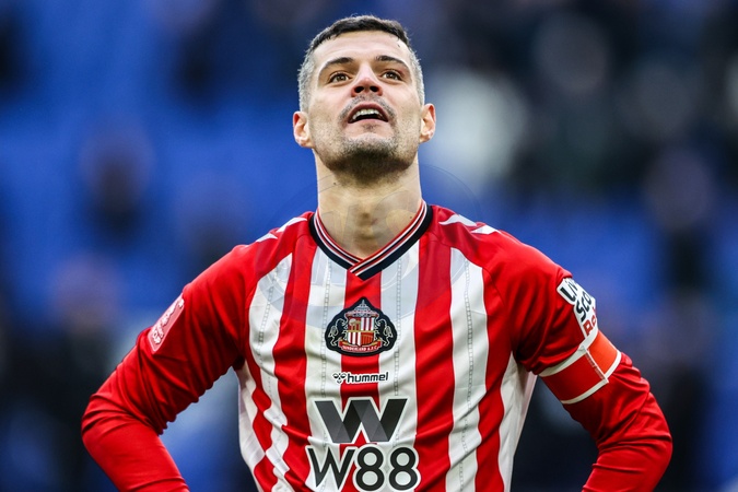 GranitXhaka of Sunderland looks up to the travelling fans after the game during the Emirates FA Cup Third Round match Everton vs Sunderland at Hill Dickinson Stadium, Liverpool, United Kingdom, 10th January 2026, Credit:Ae Cosgrove/News Images / Avalon