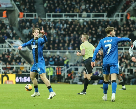 Alex Scott of Bournemouth celebrates his goal to make it 1-1 during the Emirates FA Cup Third Round match Newcastle United vs Bournemouth at St. James's Park, Newcastle, United Kingdom, 10th January 2026, Credit:Richard Bierton/News Images / Avalon