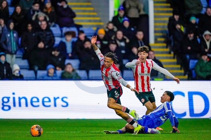 Romelle Donovan of Brentford tackled during the Emirates FA Cup Third Round match Sheffield Wednesday vs Brentford at Hillsborough, Sheffield, United Kingdom, 10th January 2026, Credit:Maynard Manyowa/News Images / Avalon