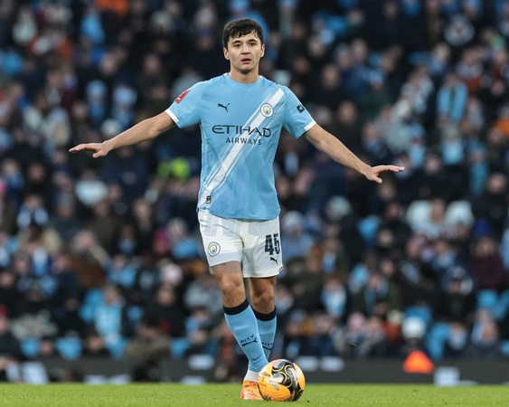 Abdukodir Khusanov of Manchester City gives his team instructions during the Emirates FA Cup Third Round match Manchester City vs Exeter City at Etihad Stadium, Manchester, United Kingdom, 10th January 2026, Credit:Mark Cosgrove/News Images / Avalon