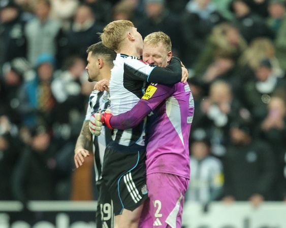 Newcastle United goalkeeper Aaron Ramsdale celebrates with team mates during the Emirates FA Cup Third Round match Newcastle United vs Bournemouth at St. James's Park, Newcastle, United Kingdom, 10th January 2026, Credit:Richard Bierton/News Images / Avalon