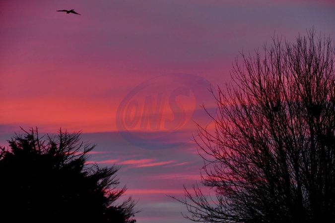 Pretty pink skies at dawn on a cold and frosty morning in the countryside., Credit:Geoffrey Swaine / Avalon