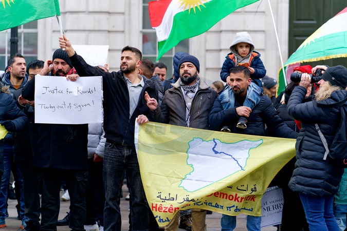Kurdish protesters calling for sanctions against Syria for attacks and a siege imposed on the neighbourhoods of Sheikh Maqsoud and Ashrafieh and other areas of Aleppo., Credit:Aldo Ciarrocchi / Avalon