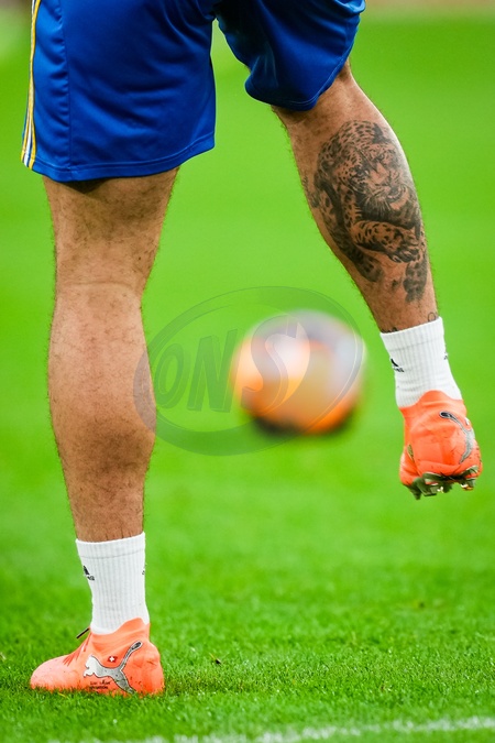 Leg tattoo of Noah Okafor of Leeds United during the Emirates FA Cup Third Round match Derby County vs Leeds United at Pride Park Stadium, Derby, United Kingdom, 11th January 2026, Credit:Maynard Manyowa/News Images / Avalon
