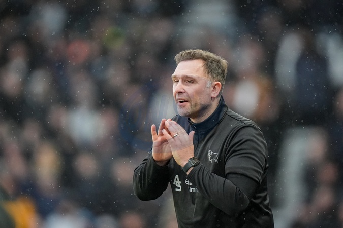 John Eustace manager of Derby County gives his team instructions during the Emirates FA Cup Third Round match Derby County vs Leeds United at Pride Park Stadium, Derby, United Kingdom, 11th January 2026, Credit:Maynard Manyowa/News Images / Avalon