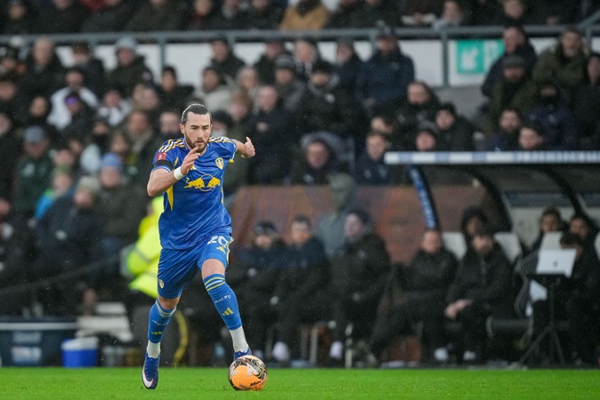 Jack Harrison of Leeds United makes a run with the ball during the Emirates FA Cup Third Round match Derby County vs Leeds United at Pride Park Stadium, Derby, United Kingdom, 11th January 2026, Credit:Maynard Manyowa/News Images / Avalon