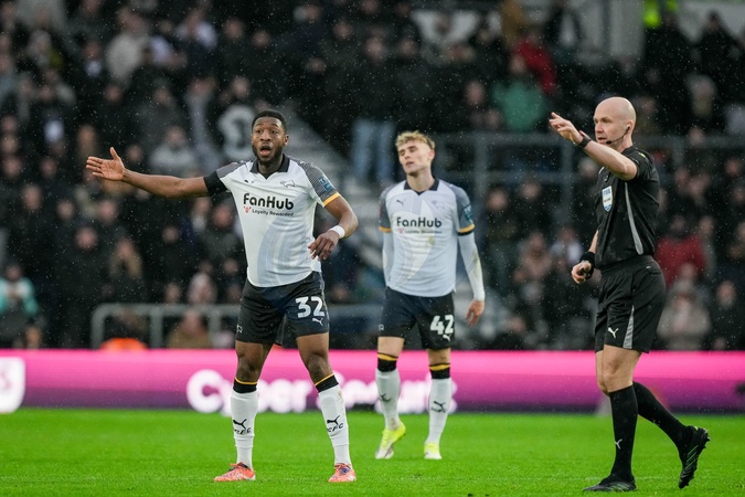 Ebou Adams of Derby County reacts after Referee Anthony Taylor makes a decision during the Emirates FA Cup Third Round match Derby County vs Leeds United at Pride Park Stadium, Derby, United Kingdom, 11th January 2026, Credit:Maynard Manyowa/News Images / Avalon