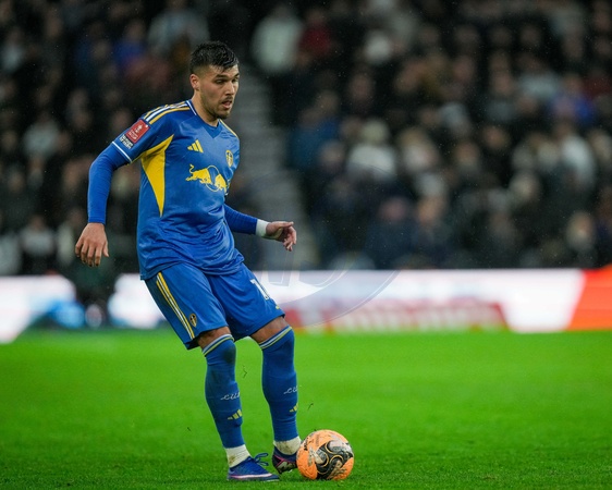 Joël Piroe of Leeds United passes the ball during the Emirates FA Cup Third Round match Derby County vs Leeds United at Pride Park Stadium, Derby, United Kingdom, 11th January 2026, Credit:Maynard Manyowa/News Images / Avalon