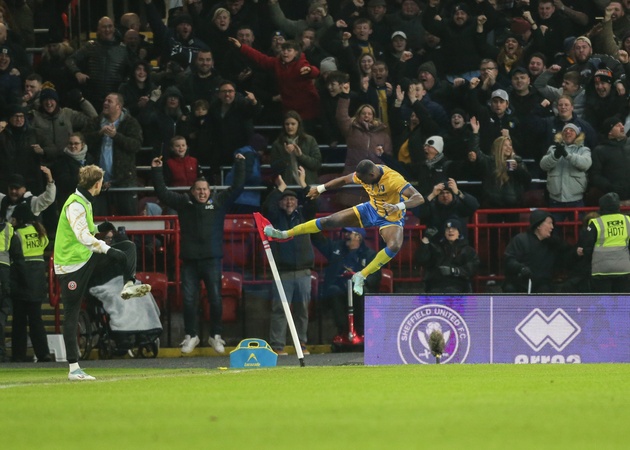 Lucas Akins of Mansfield Town celebrates his goal to make it 1-3 during the Emirates FA Cup Third Round match Sheffield United vs Mansfield Town at Bramall Lane, Sheffield, United Kingdom, 11th January 2026, Credit:Richard Bierton/News Images / Avalon