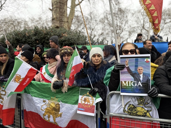London, UK. 11 January 2026. Demonstrators gather outside the Iranian embassy in London during a protest calling for democracy and political change in Iran. Protesters wave Iranian flags and hold placards reading "Free Iran” and "Democracy for Iran” as crowds assemble along the street outside the embassy., Credit:Alexander Seale / Avalon