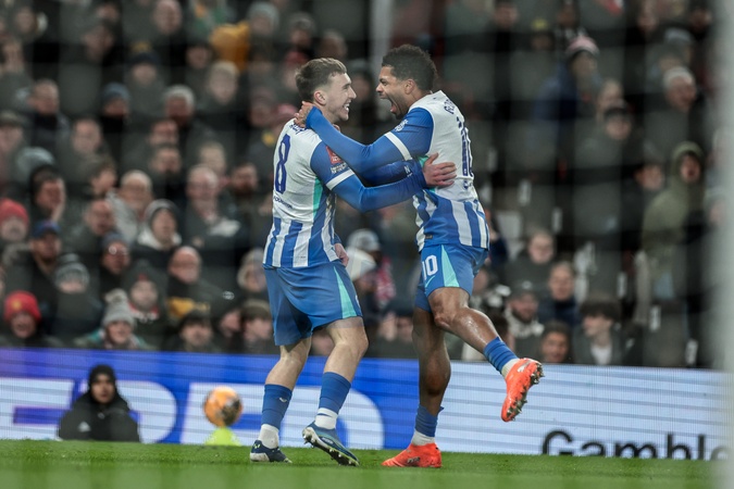 Brajan Gruda of Brighton & Hove Albion celebrates his goal to make it 0-1 during the Emirates FA Cup Third Round match Manchester United vs Brighton and Hove Albion at Old Trafford, Manchester, United Kingdom, 11th January 2026, Credit:Mark Cosgrove/News Images / Avalon
