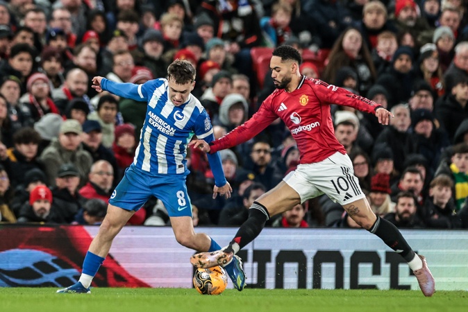 Brajan Gruda of Brighton & Hove Albion and Matheus Cunha of Manchester Untied battle for the ball during the Emirates FA Cup Third Round match Manchester United vs Brighton and Hove Albion at Old Trafford, Manchester, United Kingdom, 11th January 2026, Credit:Mark Cosgrove/News Images / Avalon