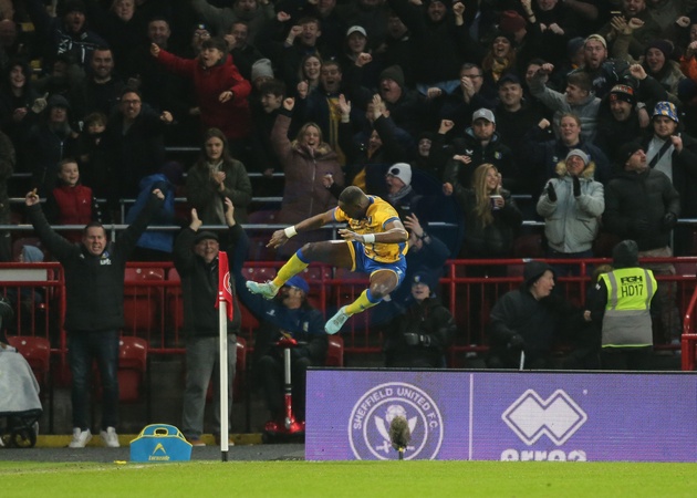 Lucas Akins of Mansfield Town celebrates his goal to make it 1-3 during the Emirates FA Cup Third Round match Sheffield United vs Mansfield Town at Bramall Lane, Sheffield, United Kingdom, 11th January 2026, Credit:Richard Bierton/News Images / Avalon
