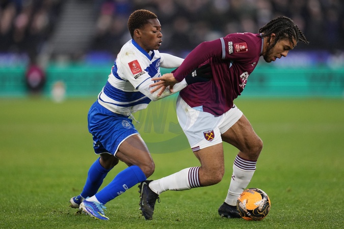 Ezra Mayers of West Ham United and Karamoko Dembélé of Queens Park Rangers battle during the Emirates FA Cup Third Round match West Ham United vs Queens Park Rangers at London Stadium, London, United Kingdom, 11th January 2026, Credit:Harvey Murphy/News Images / Avalon