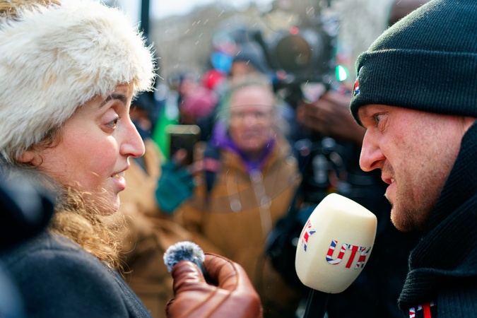 Stephen Christopher Yaxley-Lennon, better known as Tommy Robinson gives interviews at a protest against the Iranian regime and the brutal crackdown by its security forces which it is claimed has led to the deaths of at least 500 people., Credit:Aldo Ciarrocchi / Avalon