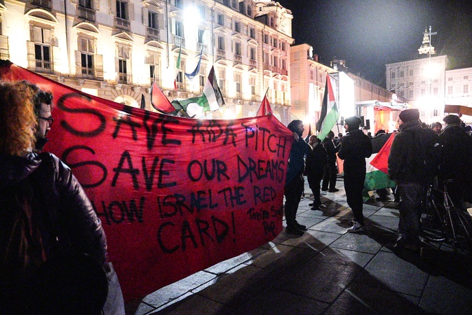 The Olympic flame for the Milan-Cortina 2026 Winter Games arrives in Turin. The photo shows a protest organized by pro-Pal protesters. Turin, Italy 11 January 2026, Credit:Selene Daniele / Avalon