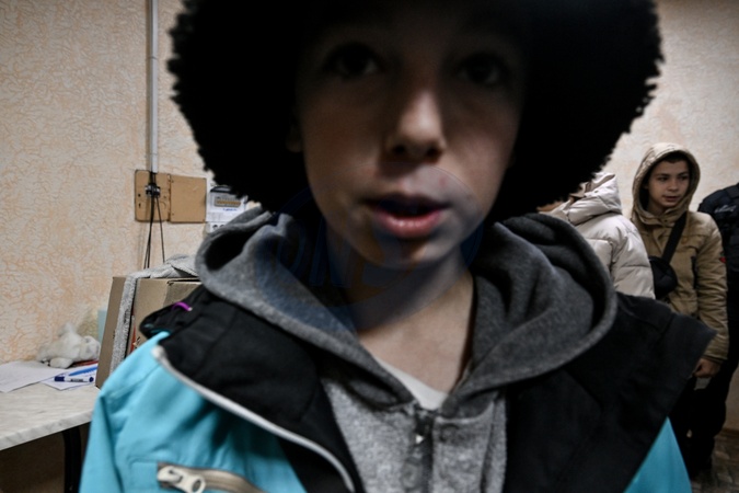 A boy evacuated from Kushuhum village is pictured at a transit centre upon arrival, Zaporizhzhia region, Ukraine, on January 8, 2026. The mandatory evacuation of residents from 33 settlements in five communities of the Zaporizhzhia region is underway as the security situation remains difficult., Credit:Dmytro Smolienko / Avalon
