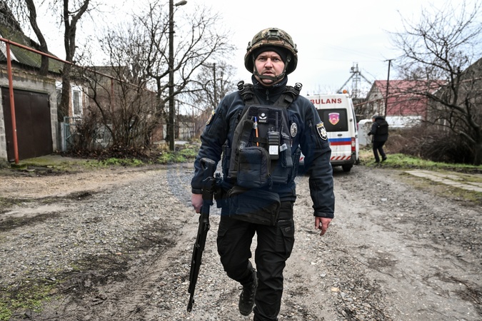 A police officer armed with a rifle participates in the evacuation of families with children from Kushuhum village, Zaporizhzhia region, Ukraine, on January 8, 2026. The mandatory evacuation of residents from 33 settlements in five communities of the Zaporizhzhia region is underway as the security situation remains difficult., Credit:Dmytro Smolienko / Avalon
