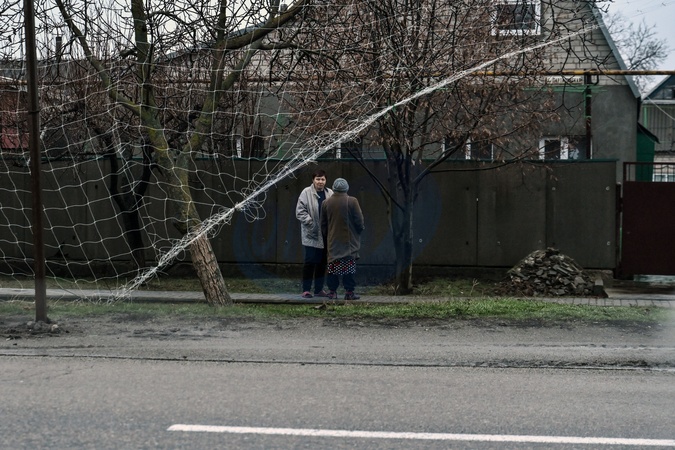 Two women talk by the road protected by an anti-drone net during the evacuation of families with children from Kushuhum village, Zaporizhzhia region, Ukraine, on January 8, 2026. The mandatory evacuation of residents from 33 settlements in five communities of the Zaporizhzhia region is underway as the security situation remains difficult., Credit:Dmytro Smolienko / Avalon
