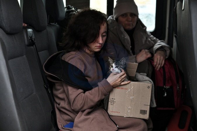 A girl holds a box with a cat as volunteers prepare to transfer families with children evacuated from Kushuhum village from a transit centre to safer temporary accommodation, Zaporizhzhia region, Ukraine, on January 8, 2026. The mandatory evacuation of residents from 33 settlements in five communities of the Zaporizhzhia region is underway as the security situation remains difficult., Credit:Dmytro Smolienko / Avalon