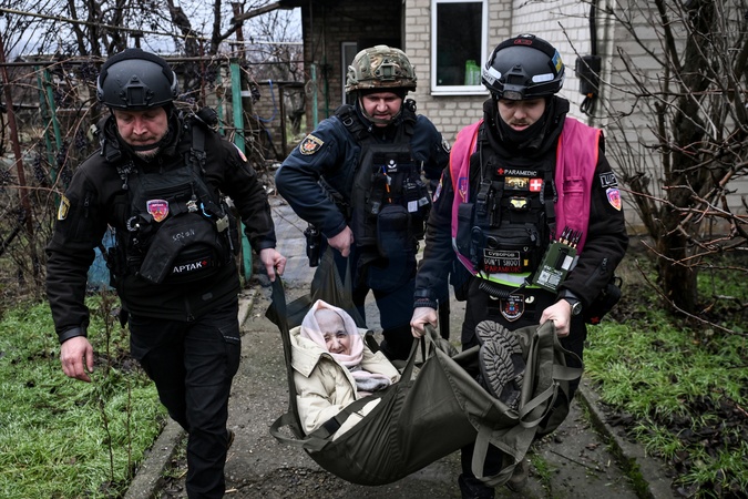 A police officer, a paramedic and a volunteer carry an elderly woman being evacuated at the request of her relatives, Kushuhum village, Zaporizhzhia region, Ukraine, January 8, 2026. The mandatory evacuation of residents from 33 settlements in five communities of the Zaporizhzhia region is underway as the security situation remains difficult., Credit:Dmytro Smolienko / Avalon